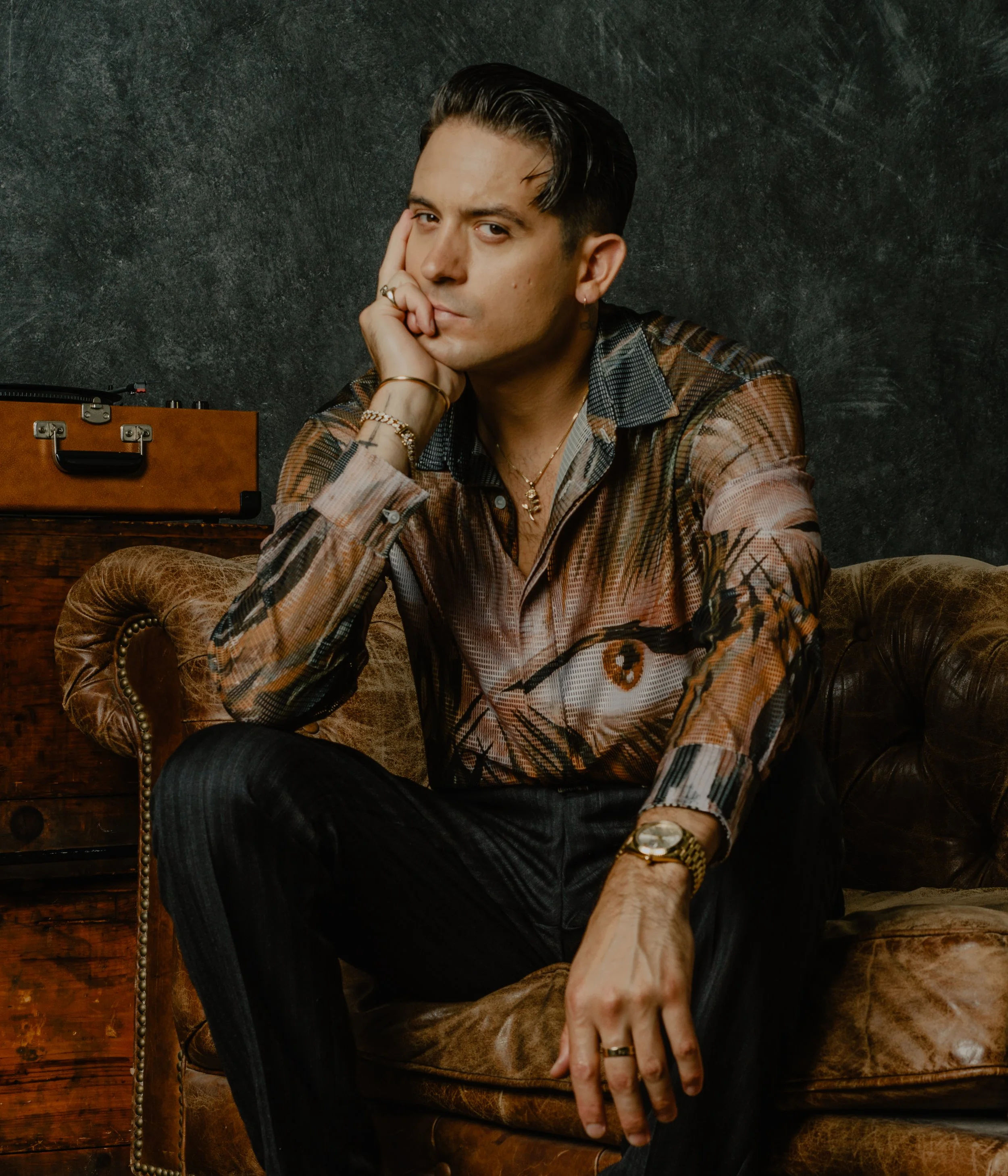 A man sitting on a leather sofa with a dark textured wall in the background. He is wearing a patterned shirt, black pants, gold watch, and accessories. He has slicked-back dark hair and is resting his head on his hand with a thoughtful expression.