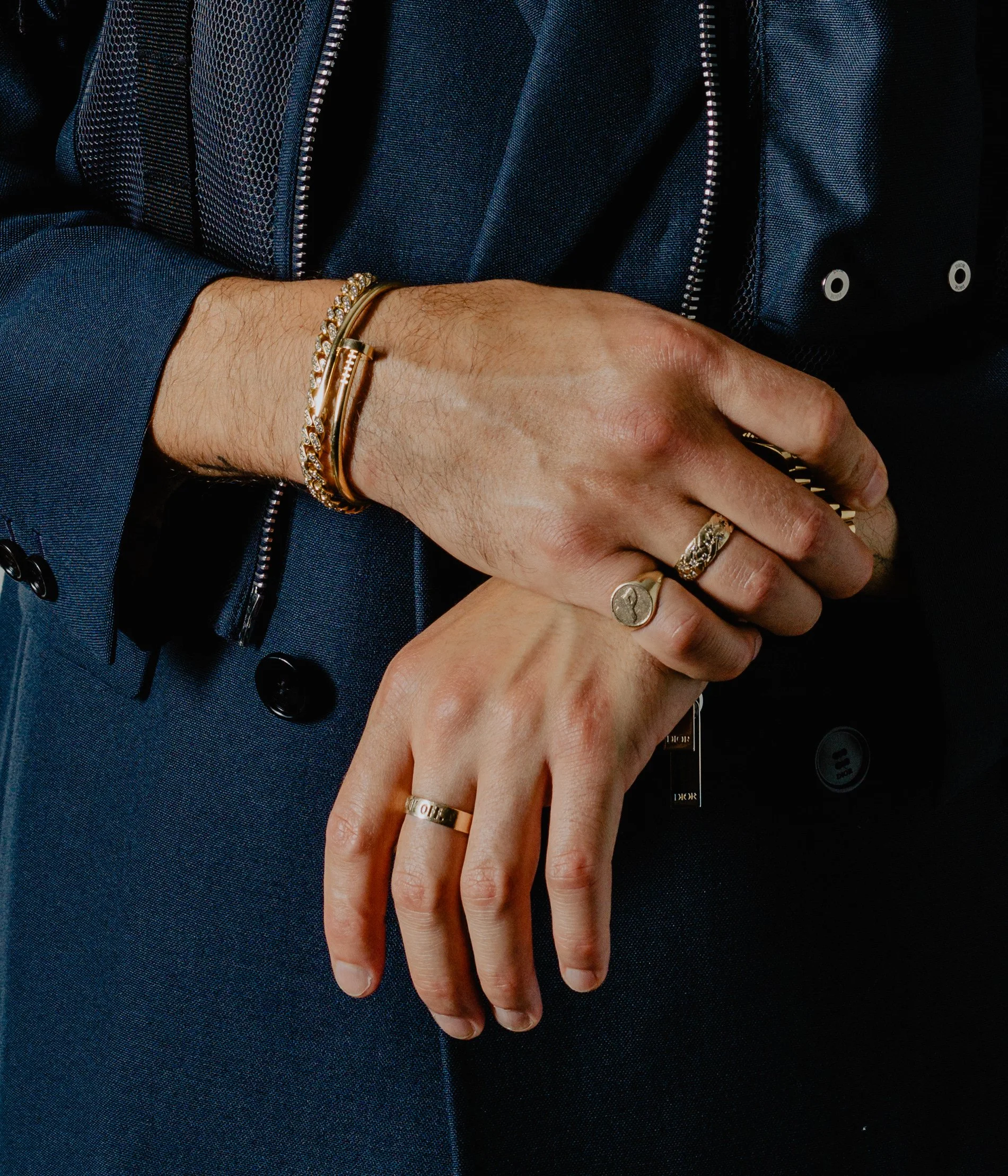 Close-up of a person's hands and wrist adorned with jewelry, wearing a dark blue patterned jacket.